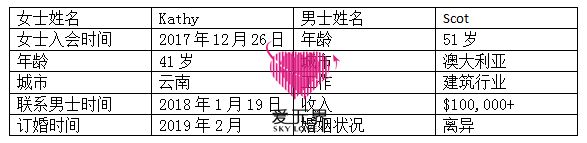 有时候,选择非常重要,选择对了,并为此付出努力,收获的东西也是成正比的,在对的平台上,Kathy桃花朵朵开,入会不久,就吸引了不少澳洲男士的青睐。Scot就是女士入会后遇到的其中一个男士。