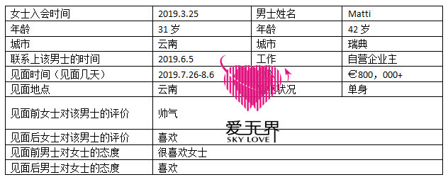 6月5号,我们物色了来自瑞典的Matti,男士今年42岁,在瑞典有多处房产,自己有一家公司,从事咨询行业,经常做慈善事业,男士还很喜欢度假,所以也按照自己喜欢的风格设计了几个林中小屋和度假房,他看起来年轻、帅气、阳光,正是小凤喜欢的类型。