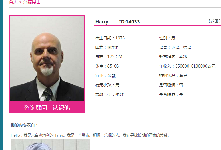 Harry来自奥地利,精通英语和德语两种语言,也是阿里红娘官网上的优质男士。从Jane入会开始她就希望能和这个男士交流上,阿里红娘根据女士的择偶标准进行了精准匹配,特意给她联系了来自奥地利的Harry。