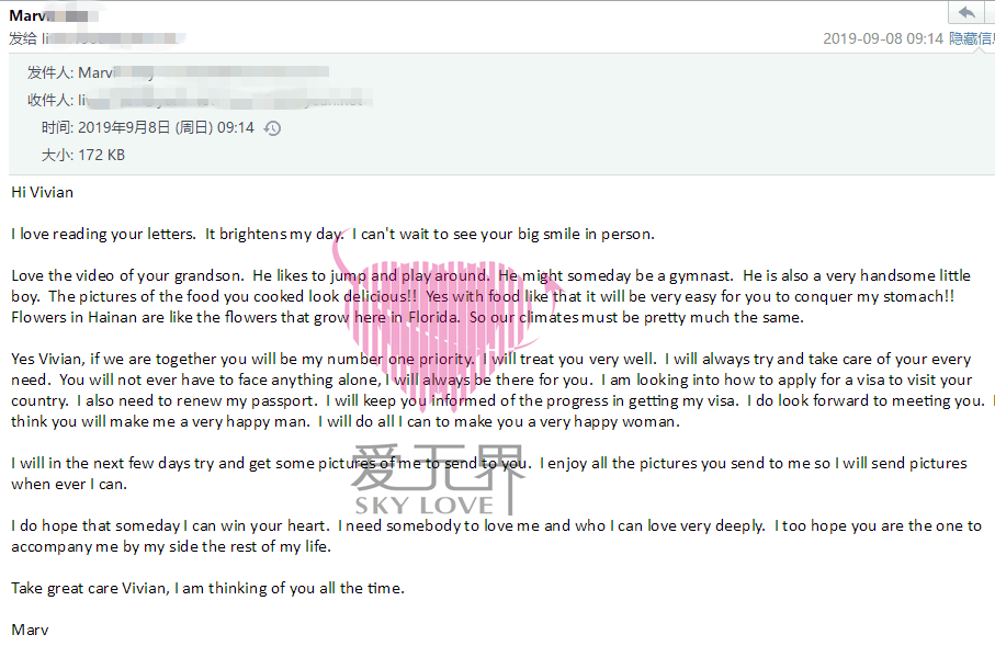 女士Vivian已经59岁,来自海南海口。是一位非常暖心,爱笑的姐姐,是一位退休大学教授,一位知书达理,努力的姐姐。要知道在这个年纪再去学习一门语言是很难的,但是我们Vivian姐姐从来不需要我们翻译男士的信件,她会自己努力去看,去学习,不懂的地方用翻译软件研究。而且也自己努力用英文写信,写的很不错呢!