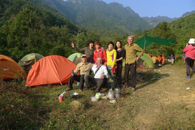 爬到山顶,安营扎寨,天还没黑,Stefan开心和大家合照
