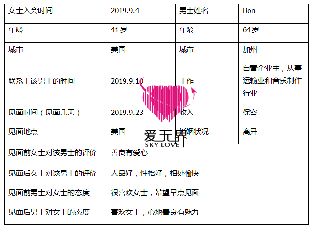 张女士来自河北,和自己的儿子移民到美国生活的她,一直很想重新开启一段婚姻,但经常和华人圈打交道的她没有机会去接触到美国上流圈,她急需一个资源丰富且专业的机构帮助她开启跨国幸福。2019年9月4日,她加入了阿里红娘。