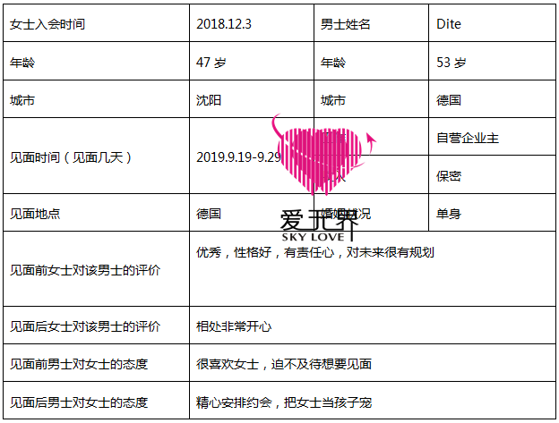 Dite来自德国,是一位电气大师、自营企业主,同时在多个领域均有投资,经济优渥,今年53岁的他看起来非常年轻,整个人充满了活力,对生活充满了激情,他在和女士共同谋划两人幸福的未来,很有责任心,这一切一切都让廖女士赞叹不已,她很期待和男士在一起的未来。刨去那些华丽的外在因素,在婚姻里,唯有性格和品德能带来长期的温暖和安全感,Dite简直就是完美伴侣。