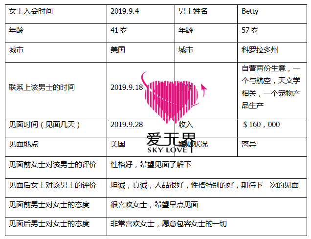 9月28日,张女士和来自科罗拉多州的Betty见面了,男士自营两份生意,一份与航空,天文学相关,另一份则是宠物产品生产行业,Betty的身上有着科罗拉多州男士的优秀品格,为人性格好,坦诚,脾气也很好,这让张女士和他相处的过程中感觉特别愉快。