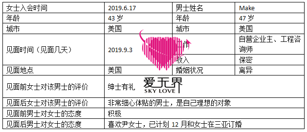 11月4日,X女士再次飞往美国,两人在拉斯维加斯浪漫相约,目前,男士正在办理中国签证,计划在12月和尹女士在三亚订婚!阿里红娘期待那一天的到来,也祝贺X女士成功牵手心仪的男士!