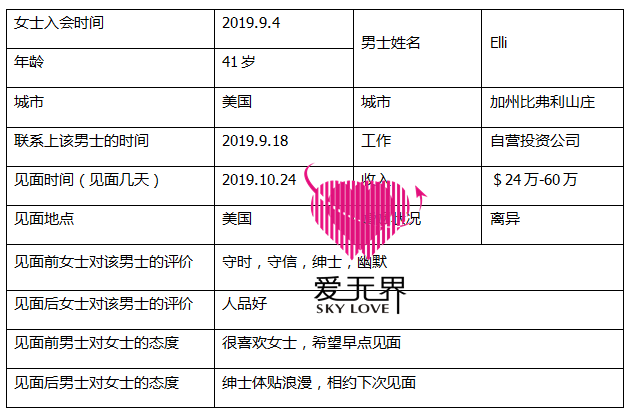来自河北,生活在美国的张女士,入会以后,在阿里红娘桃花朵朵开,短短时间内就和多个阿里红娘服务组为她筛选匹配的优质男士陆续见面,这一次,她相约的是住在比弗利山庄的Elli。
