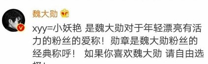 这个“xyy”被人认为是在 暗指 杨幂“小杨杨”,不过此前魏大勋本人曾表示“xyy”是指的“小妖艳”。