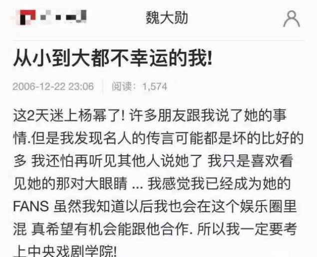 至于杨幂就更巧合了,魏大勋多次公开在社交平台上表示过,喜欢杨幂崇拜杨幂,更早的时间可以回溯到2006年,魏大勋表示迷上了杨幂,想考上中央戏曲学院,和杨幂一起合作共事,想来这段“喜欢”维持的年限还是不断。