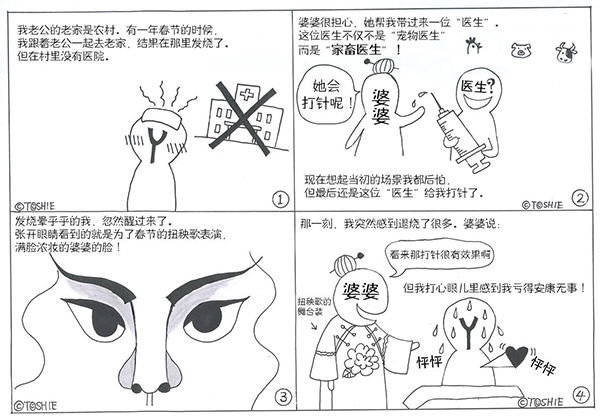 日本妻子Y(在华14年,孩子在读小学):我老公出身农村,有一年我和他一起回乡下过年时突然发烧了。由于当时他的家乡没有诊所,婆婆急忙找来人给我打针。我后来才知道打针的医生是兽医!退烧之后,我一睁眼,化着大浓妆正准备去扭秧歌的婆婆对我说,还是打针管用吧。每每回想起来,我就觉得能活下来真好。