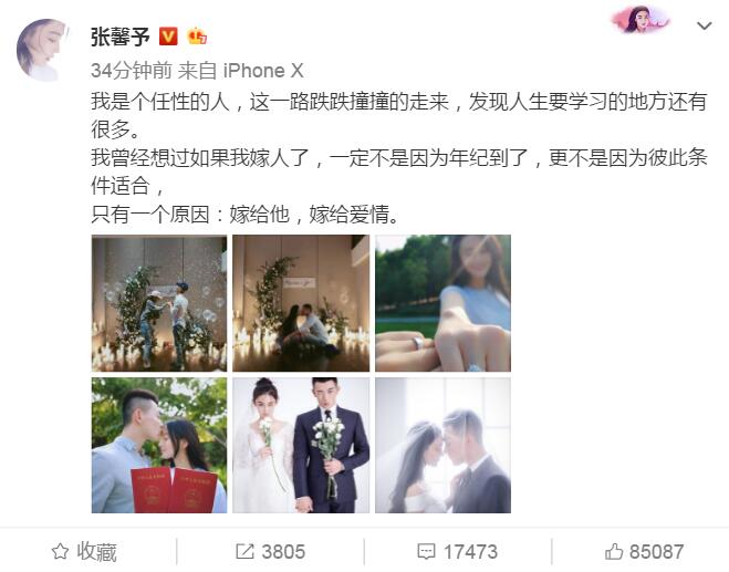 张馨予微博宣布结婚:嫁给他,嫁给爱情
