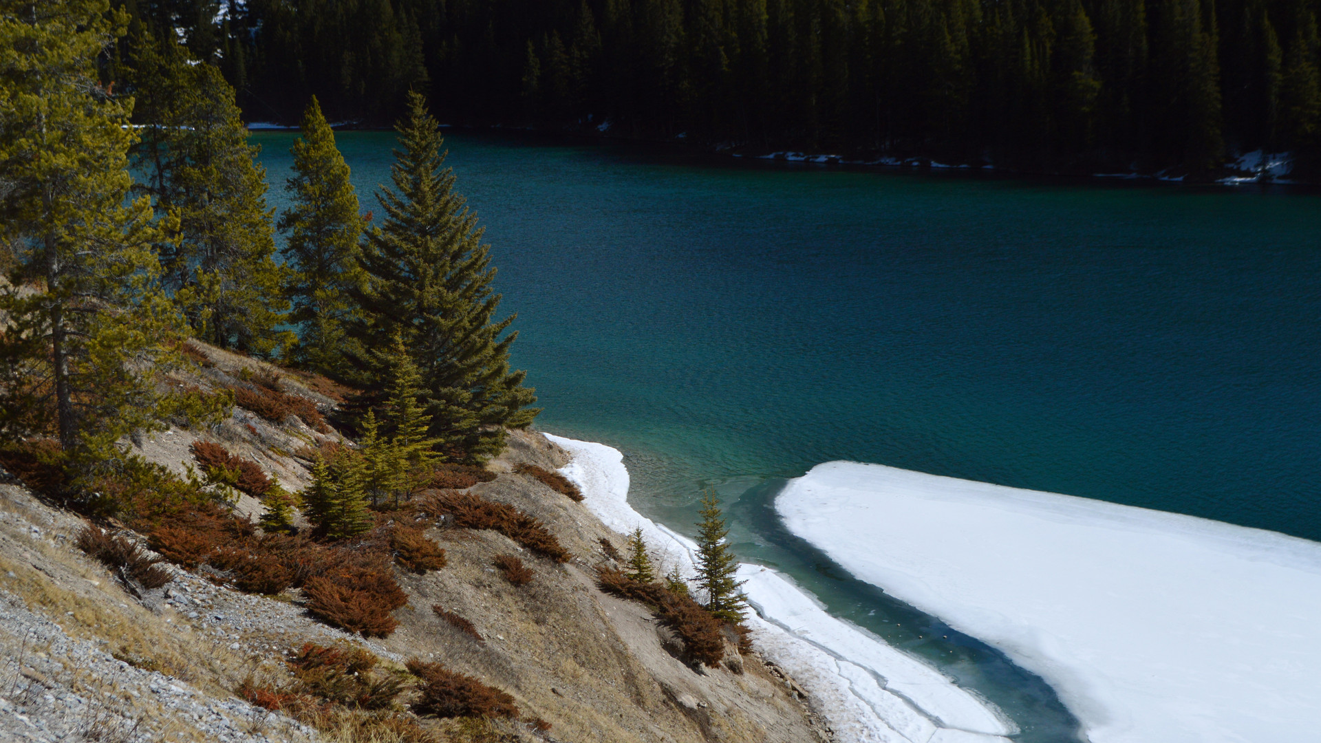 蓝白色的冰雪湖水及浓绿色的针叶林