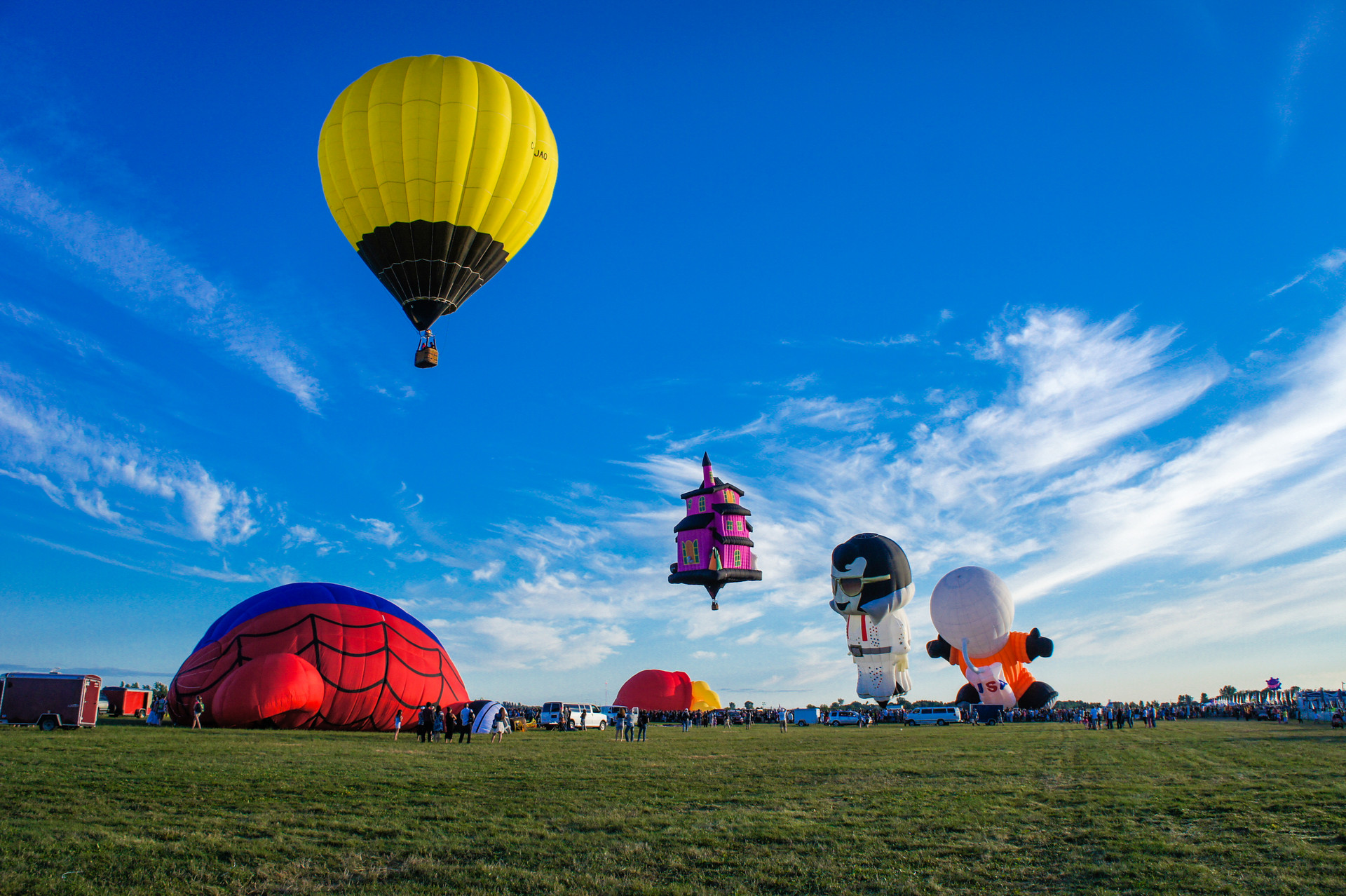 五彩缤纷的、各种形态的热气球在一处一比高下