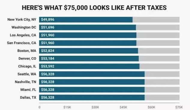 而能拿到7.5万美元的男士一般是硕士毕业,三年以上工作经验,从事IT、律师、金融、研发、医生等行业,所以你也会发现在阿里红娘嫁到美国的女士大部分找到的男士也是这样的。像下图就是美国男士年薪7.5万美元的税后收入,从图上可以看出,纽约年薪7.5万人士实际只能到手4.9万美元,洛杉矶和三藩市能到手5.1万美元。