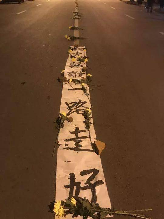 △路面上摆放着菊花,写着挽言:救火英雄一路走好。