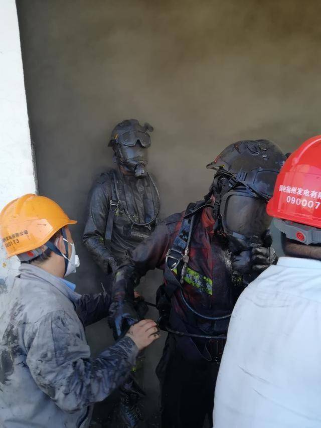 消防战士们浑身覆盖了厚厚的煤灰,
