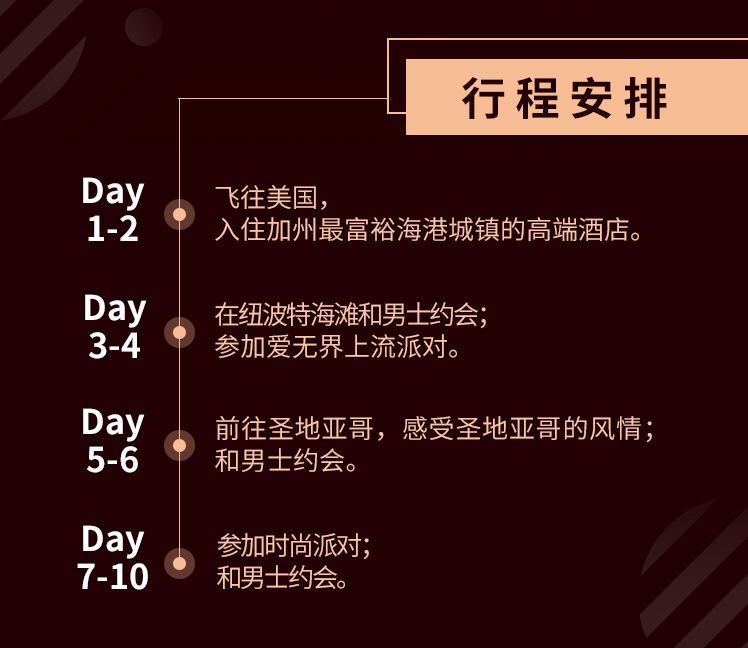 美国名流殿堂之旅是阿里红娘为尊贵的女士特别定制的奢华寻爱之旅,去最时尚的城市,进入美国的名流阶层,与单身贵族相约殿堂。更有美国知名情感大咖Jerod作为私人教练,指导您西方交友礼仪,带你参加时尚派对,与绅士们一对一约会,让您尽显东方魅力,动人风姿!