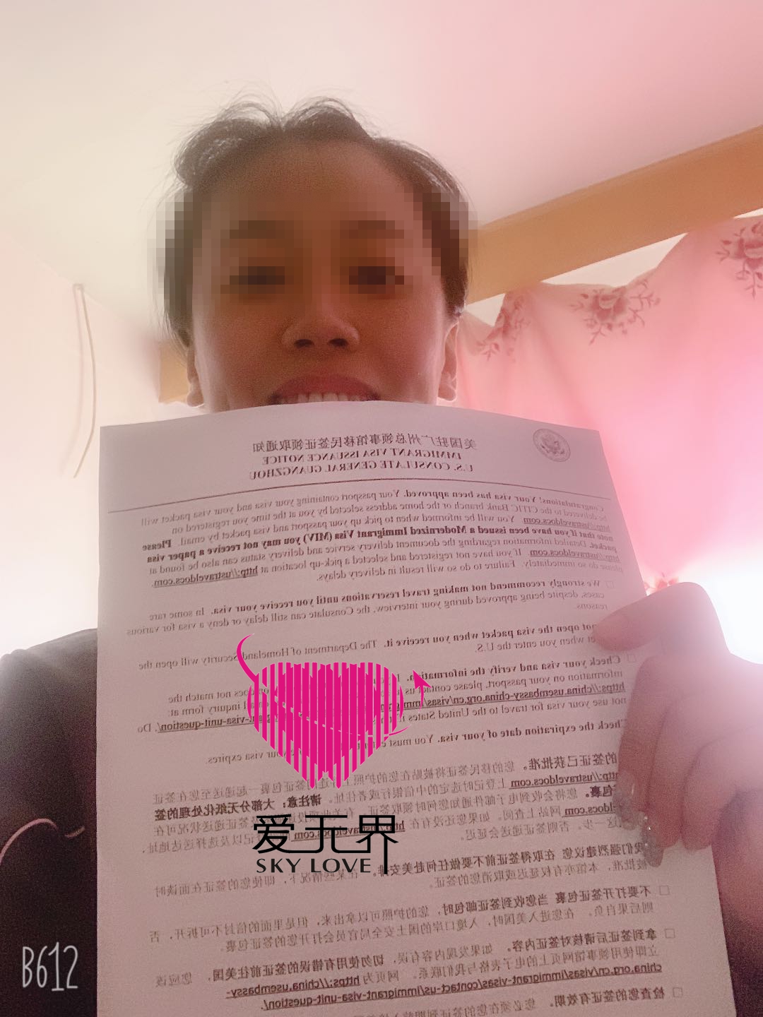 2019年6月1日,谢女士在阿里红娘总部旁的美国大使馆面签成功;