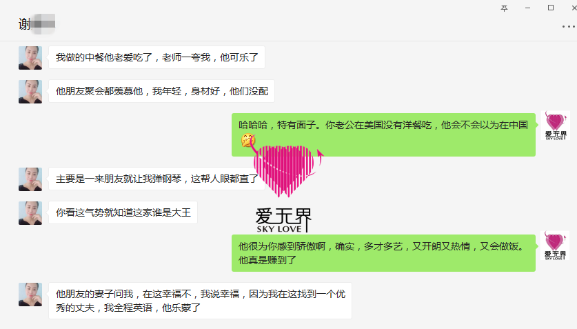 娶到谢女士是Dana大叔最自豪的事!他最喜欢向亲朋好友介绍谢女士,而且是一脸的爱慕!谢女士有着东北女性的开朗活泼自信,不管英语说的怎样,都大胆表达!Dana的亲戚朋友都很喜欢这位中国女士,可不!中餐做得好、为人热情好客、不怕羞不扭捏、大胆表达、爱说爱笑、还弹得一手好钢琴,可不是人见人爱嘛!