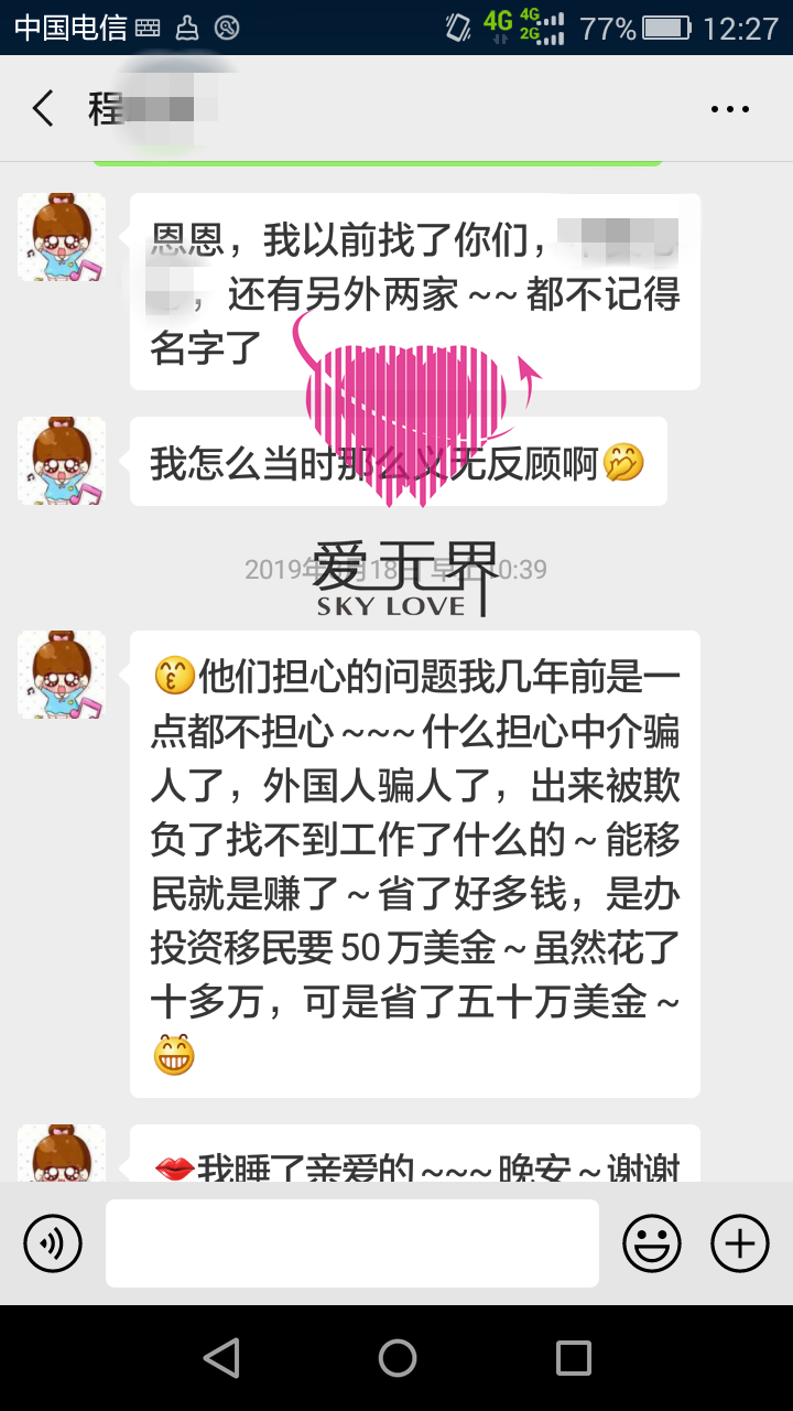 程女士:现在回想起来,当时在我心里从来没有想过那么多,担心过那么多,我当时只有一个信念——嫁出去我就是赚了!中国资产千万以上的上层人士不是移民了就是在移民的路上,他们花的时间和费用成本甚至风险都远远高得多,阿里红娘不仅帮我找到一个爱我的人,让我有了一个温暖的家,更是一步到位让我移民海外,孩子享受着高品质教育,享受国外优渥的福利和轻松的生活环境…真的是一举多得的选择!