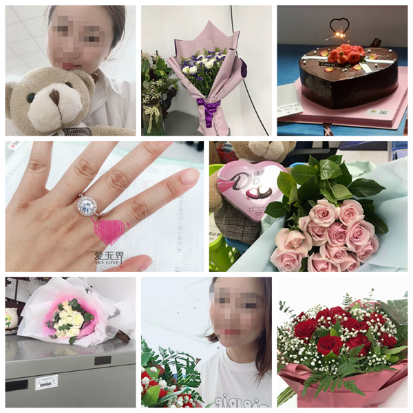 自从在单身交友网站上邂逅,两人从7月开始相恋,小莹姐几乎每周都收到Jimmie的惊喜礼物。红玫瑰还在办公室里绽放着,新一周的白玫瑰就已经送到小莹姐手上;爱心蛋糕的甜蜜还在心中荡漾着,第二次又双叒收到了粉色花束和巧克力......