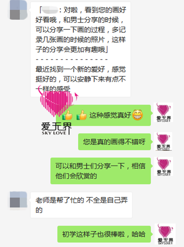 和男士们分享时,张女士的画作也得到了男士的认可,由于张女士还喜欢读历史、心理学、哲学相关的书籍,也被男士夸内外兼修。张女士亲身验证了有自己的爱好、生活充实就是最大的魅力,现在的她心情更加愉悦了,对人对事更能够保持平常心。
