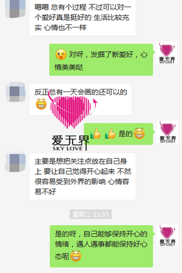 在女士入会初期,情感老师一般会鼓励女士多培养爱好,让自己的生活充实有趣,其实这并不是打发女士时间,而是一个有着健康的兴趣爱好的人,能更容易化解所遇到的困境,更容易在心理上治疗自己。
