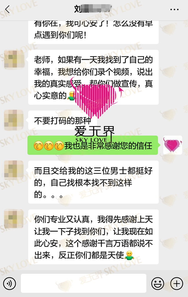 刘女士入会仅仅一个月,就有三个很真诚的男士在交流,甚至有一个男士还确定了自己的感情,要跟刘女士进一步发展。来阿里红娘之前,刘女士对国际交友有过了解,知道自己来做这件事根本达不到这样的效果,她感受到服务组工作的不易以及专业,对阿里红娘自然也是毫不吝啬自己的赞美啦。