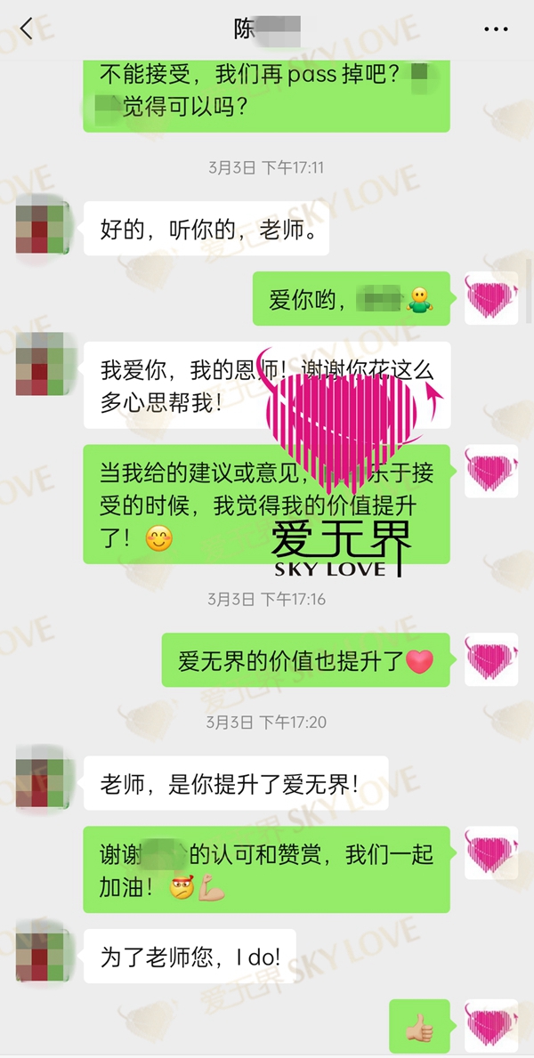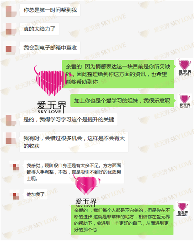 在初期,陈女士和男士交流时总讨论自己的女儿,忽略男士聊到的话题及谈论自己或跟男士互动的问题。情感老师就给女士分析,男士的每一段话具体是什么意思,重点标出男士的哪些言语是可以反映出他的特点、优点。引导陈女士有了初步的认识后,又和她一起探讨可以如何回应或者提问、如何表达自己的观点、看法等等。在这样细致的指导下,陈女士在回信内容上有了很大的改变与进步。