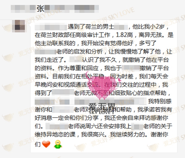 在开启服务的一个月,张女士遇到了在荷兰财政部工作的男士。由于张女士内心对于自己“想要什么样的另一半、想要什么样的婚姻”还没理清,差点就错失了这位男士。