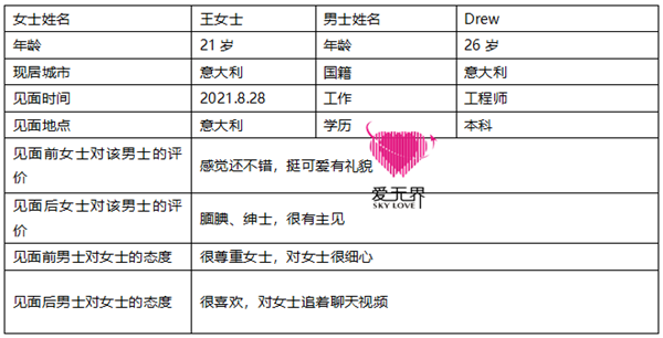 王女士和情感老师反馈时,感谢情感老师给予的见面指导,让她发现“社交”也并没有那么复杂。而且她对Drew很满意,接触的整个过程,Drew都很绅士,保持着恰当的“社交距离”,不会有肢体接触,也不会聊过分的话题,对她很尊重。