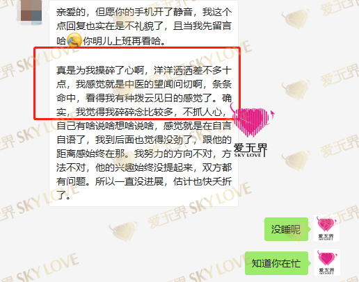 此后,梁女士果真改变了很多,非常配合情感老师的指导,任何进展都第一时间汇报情感老师,遇到困难时主动寻求情感老师帮助,与情感老师细细分析,坦诚说出自己的想法和对男士的看法,听取情感老师的建议!