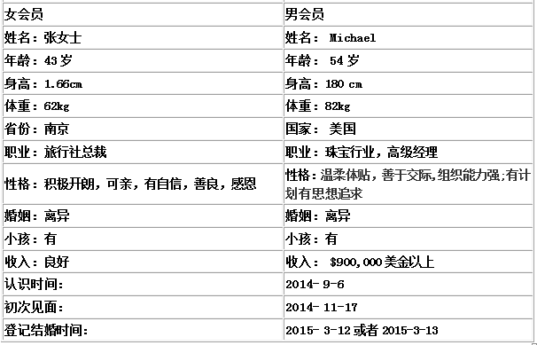 43岁的张女士和美国54岁男士Michael于2014年11月17日第一次见面时,两人已深深喜欢上对方,希望在未来能携手共渡,男士曾经在第一次见面后便问张女士要一个承诺:希望下一次见面时,能决定与他结婚的时间!而且,而且第二次见面的时间就定在2014年12月31日,他要飞过来和女士共度新年!(第一次见面详情点击:来之不易的幸福,才更让人珍惜)