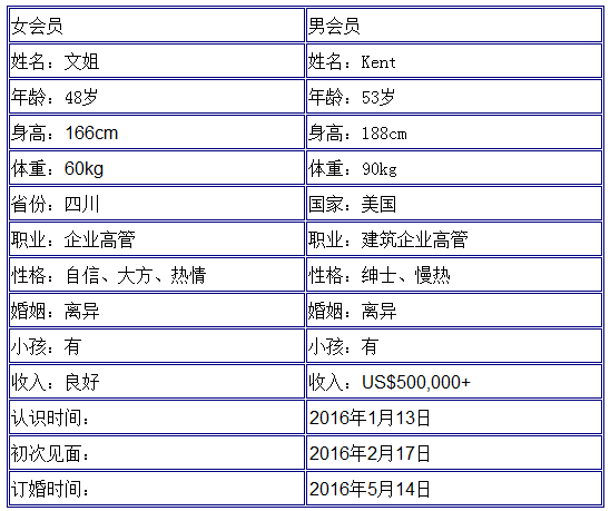 来自四川的48岁文姐自2016年2月春节飞往美国见了两位男士Evan 和Kent之后,她给自己一个月的时间考虑,最终选择了Kent作为自己的人生伴侣!