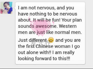 翻译:我不紧张,你也不必紧张,会很有趣的。你的计划听起来真棒!西方男人就像普通男人一样。唯一特别的是,你是第一个我独自同游的中国女人!我真的非常期待!