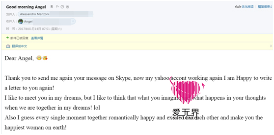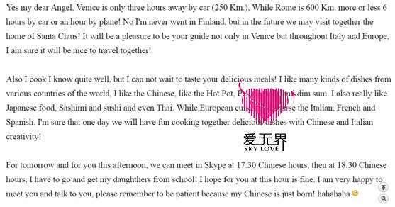 备注:男士来自意大利,54岁,女士来自重庆,41岁。男士是一个风趣幽默,积极乐观,温柔浪漫的人。每次的来信,都充满热情与激情,很容易带动对方的情绪,走进心房。男士经营自己的一家餐厅与酒店,本来预期2月底百忙抽空来重庆看望女士,但由于身体突然出现了一点小状况,所以会推迟。男士也询问女士是否愿意来意大利见面并担负来回机票费用,一切正在酝酿发展中...