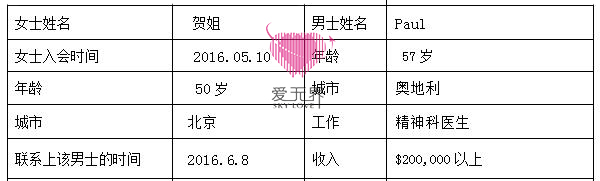 贺姐在2016年5月入会时49岁,遇见了来自奥地利的56岁Paul,Paul是一名精神科医生,也是位运动达人,身体非常健康,身材也保持得很好!两人经过两个月的沟通,在2016年7月16日见面!