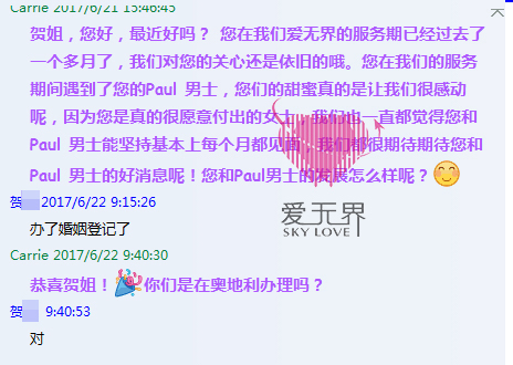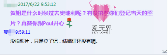 2017年6月,我们收到了贺姐的好消息!贺姐已经在奥地利和Pual登记结婚,结婚证在9月才能拿到!言简意赅的贺姐的风格依旧,她说接下来要安排时间去考取德语证书了!