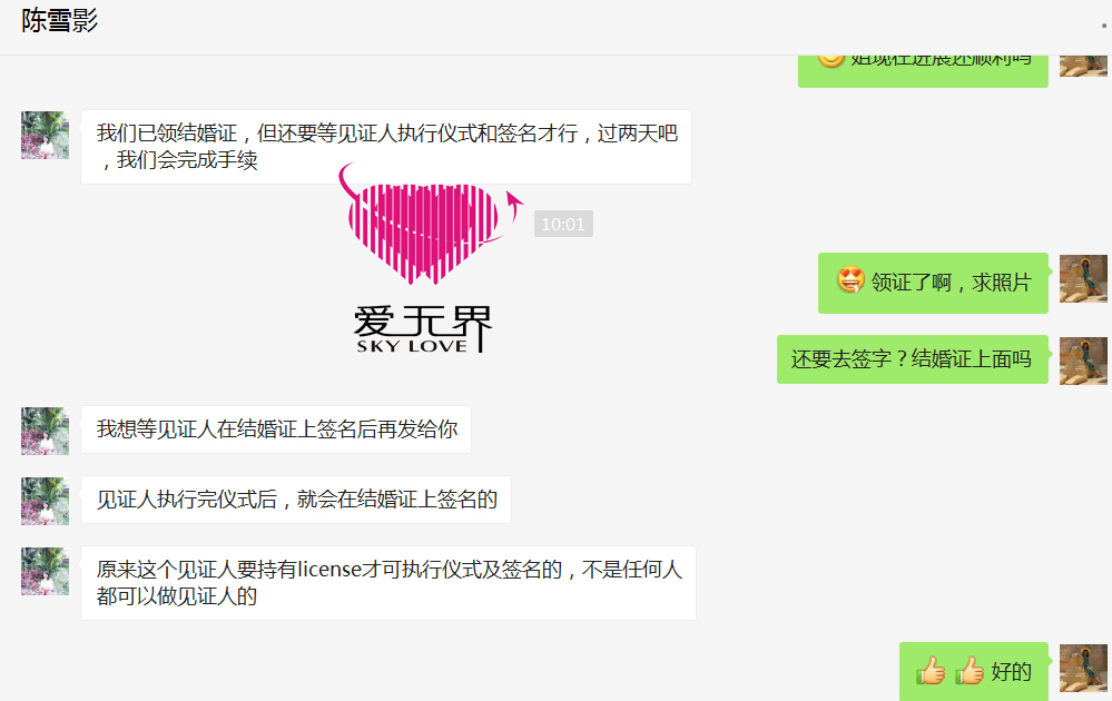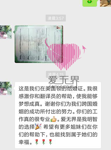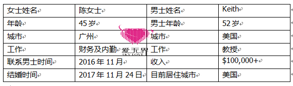 2017年11月24日,来自广州,45岁的陈姐给阿里红娘发来结婚的喜讯!陈姐与来自美国51岁的Keith在美国登记结婚啦!
