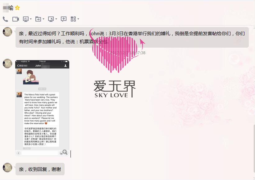 还曾记得那个在阿里红娘大家庭里有着"小李小璐"之称的小瑜吗?2018年3月3日她和未婚夫John将会在香港举行婚礼啦啦啦啦!!!届时,阿里红娘的代表受邀也将带着祝福参加小瑜的婚礼,见证两人相识、相知、相恋、相爱到组成幸福家庭一路走来的幸福。