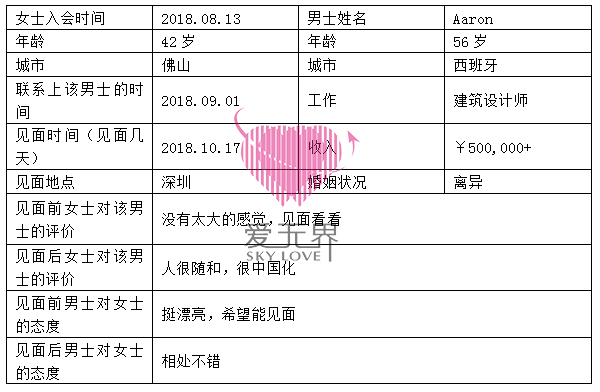都说当一个女人开始勇敢的追求爱情,在爱情里面收获自信变得更美,花自盛开蝴蝶自来。在18年9月份,她遇见了帅气充满魅力的男士Aaron 。Aaron是建筑工程师,理工男,不怎么擅长聊天的他,语气里总是透着认真,女士的每一封信都会仔细认真的做回复,女士也很喜欢向他诉说自己生活中的点点滴滴,好像认识了很久。