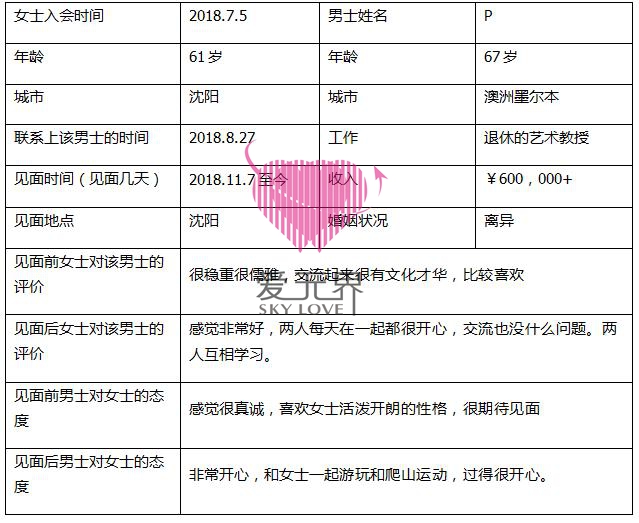 P今年67岁,是一名退休的艺术教授,来自澳洲墨尔本,非常喜欢中国文化,喜欢学习,寻寻觅觅,茫茫人海中,他一直在找一个善良温柔、脚踏实地、好奇心强又喜欢大自然的女人,而顾女士便是这样的人,两人一拍即合。