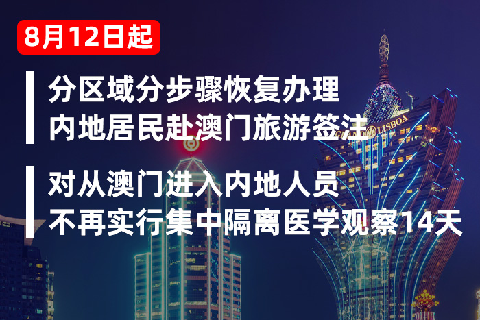 国家移民管理局8月11日发布通知:将分区域分步骤恢复办理内地居民赴澳门旅游签注: