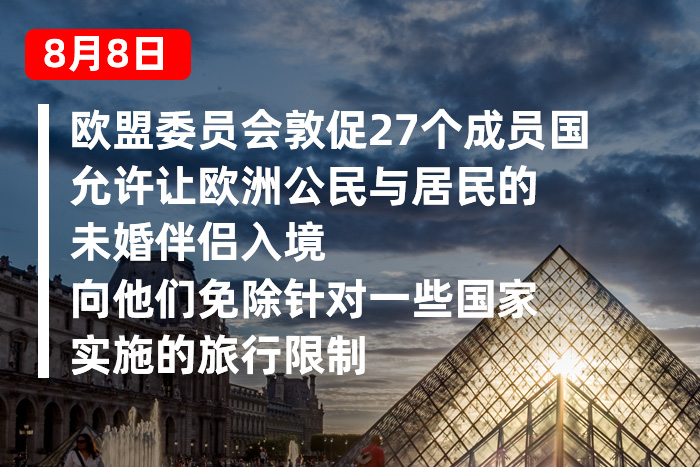 8月8日,欧盟委员会敦促27个成员国允许让欧洲公民与居民的未婚伴侣入境,向他们免除针对一些国家实施的旅行限制。包括来自非欧盟国家的情侣一方将被允许入境德国,与恋人相聚;入境法国的情侣一方提供二人的“感情证明”,申请人颁发通行证。其余欧洲国家也在积极响应,使跨国有情人免于旅行禁令得以相见。