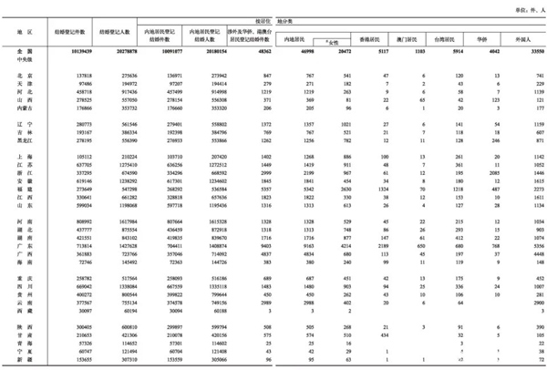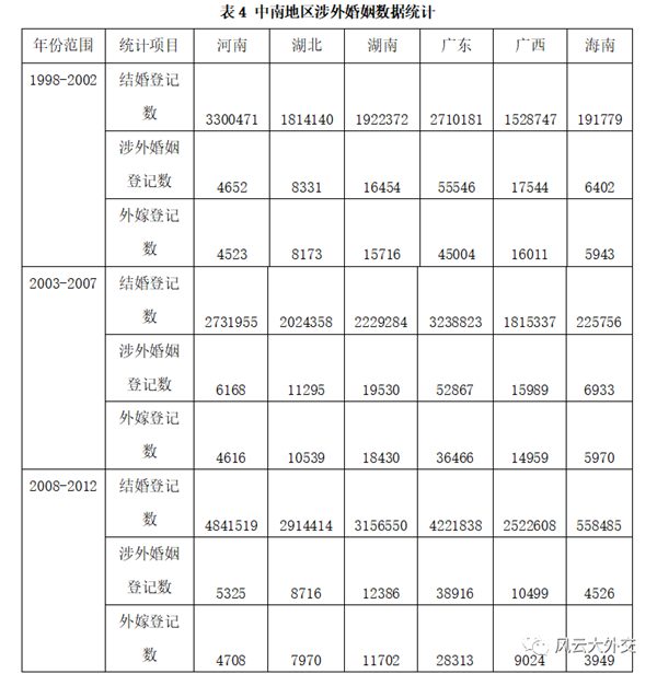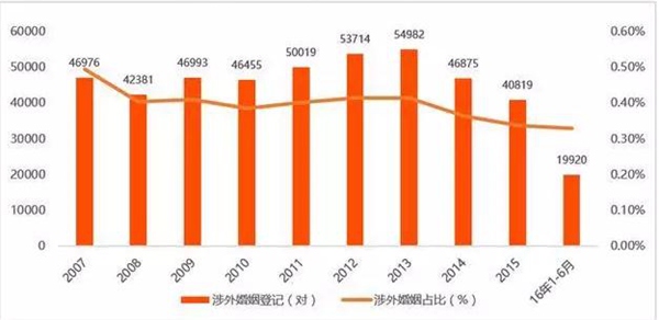 根据中国民政部的海外交友数据,从2007年到2016年6月份,中国共有11326万对夫妻结婚登记,其中涉外结婚登记(涉外国人、涉华侨、涉中国香港、澳门、台湾地区居民的结婚登记,下同)共44.9万对,占结婚登记总量的0.4%。