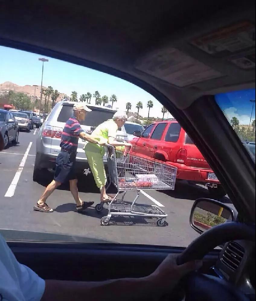 6.网友在车里偷拍到一幕甜甜甜的画面:奶奶童心未泯地站在购物车上,爷爷任劳任怨的在背后,轻轻推着小车前进。