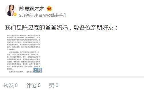 1月18日,陈昱霖的父母通过女儿的社交账号发出长文替女儿发声,他们在文中表示,女儿自曝与吴秀波的婚外恋情后,男方以私下解决的形式进行了沟通,并愿意给一笔分手费,并希望女儿不要再爆料,但随后男方找借口仅支付一小部分钱后却以“曝光隐私勒索钱财”为名报警抓捕了女儿,至今已有2个月,如罪名成立或面临十年以上有期徒刑。